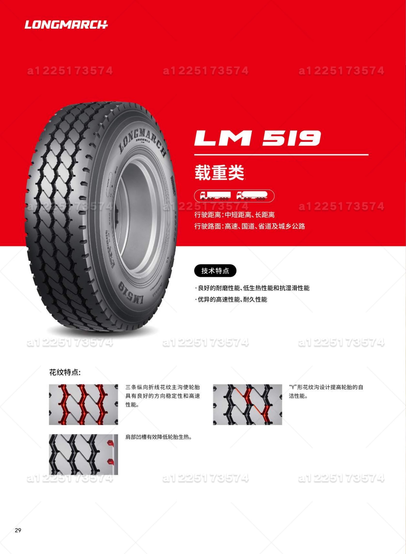 1.优异的耐磨性能、高速性能、耐久性能和舒适性能2.独特的胎圈结构设计提供优异的胎圈耐久性3.超低的滚动阻力,更低的行驶温度,更节省燃油
