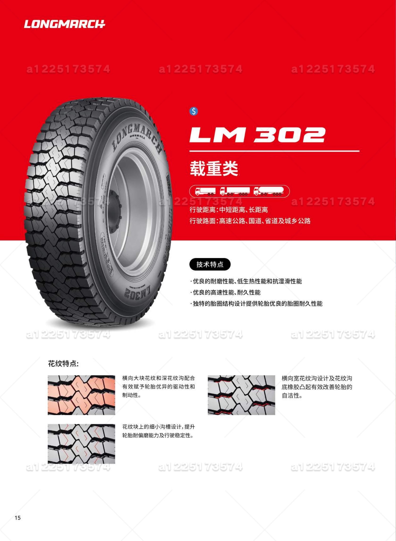 1.优异的抗刺扎性能,耐磨性能良好2.优异重载耐久性3.载重状态下,车速在40km/h以下行驶寿命更长
